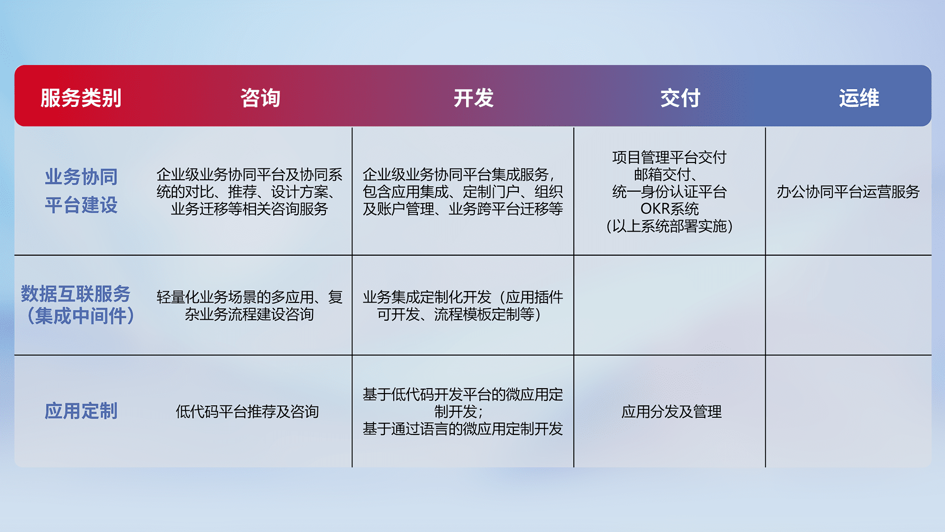 针对钉钉、、企微、、、、IDaas等平台级产品提供产品的规划、、、、方案、、交付、、、定制化开发等服务,,实现如统一协同办公、、、、智能客户服务、、、混合会议管理、、、智能数据查询、、、、等业务场景,,,实现数字化转型。。。